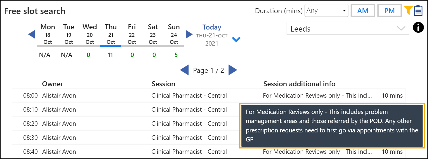 Free Slot Search - The Free slot search screen now displays the full Session name and Session additional information: