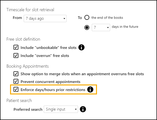 Enforce days/hours prior restrictions - There is now a practice wide setting to enforce appointment booking restrictions. If Enforce days/hours prior restrictions is:
