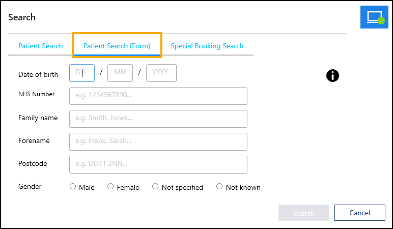• Single input - When you search for a patient, the Patient Search screen displays by default:
