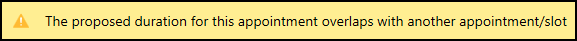 - A The proposed duration for this appointment overlaps with another appointment/slot message displays at the top of the booking form: