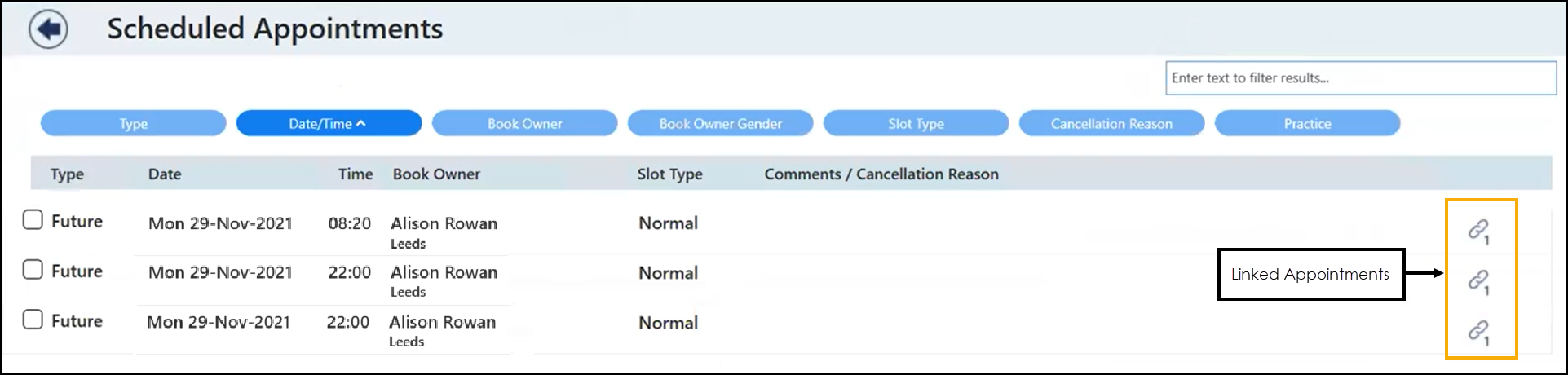 A patient may have two or more sets of linked appointments. In this case, in the Scheduled Appointments view, you can see the two sets of linked appointments are identified with a different number indicating those that are linked: