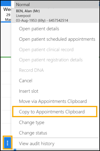 Note - You cannot copy appointments that have a status of Seen, see Appointment Status - Overview.Important - Copying an appointment copies the patient information only and excludes any appointment comments.