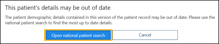 Out of date patient details - A warning message displays when a patient has been previously found by a National Patient Search and they remain on your database. It is important that you select Open national patient search to find the most up to date patient demographic details: