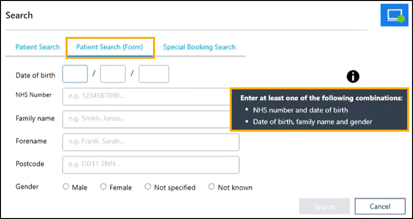 Multiple input - If your preferred search is set to Multiple input the details entered in the previous Search screen are used to perform a National Patient Search.