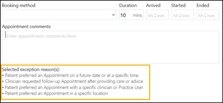 Exception Reasons (This feature is dependent on Vision 3 release DLM 890) - Exception reasons have been introduced to help differentiate between appointments that are intentionally booked outside of a two-week time frame, and appointments where patients have had to wait longer than two weeks. For example, a patient can actively request an appointment more than 14 days after the booked date, or a clinical interval exceeding 14 days maybe required: