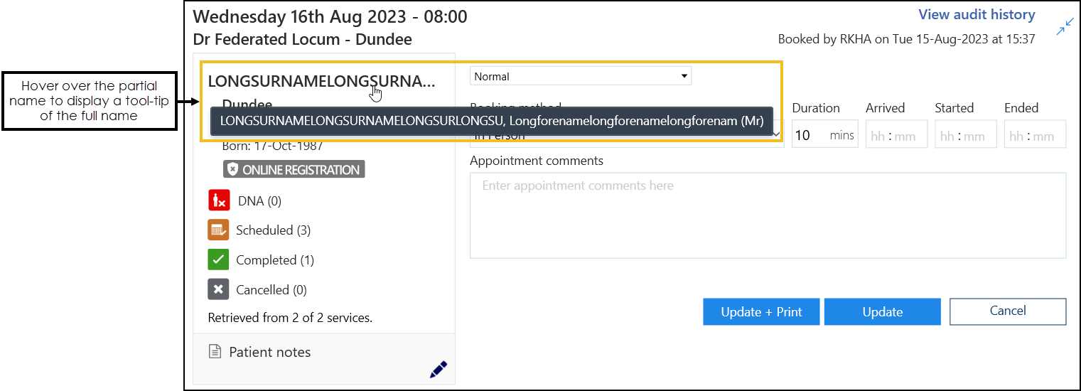 Patient Name Display - Long patient names no longer display in full on the booking form and other areas of Appointments. Where a name is truncated, three dots display next to the name to indicate part of the name is missing. Hover over the patient name to display the name in full: