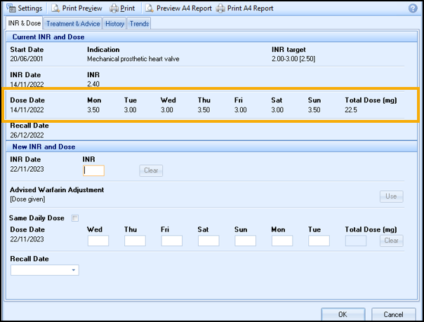 The Warfarin dose screen displays, from the Current INR and Dose section you can view the patient's last dosage: