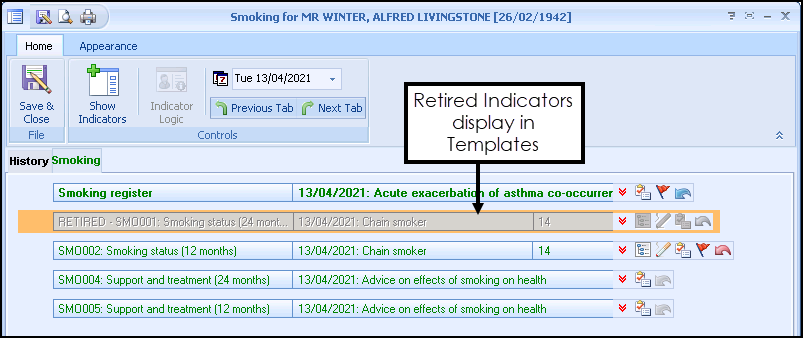 Retired Indicators, regardless of your settings, automatically display in QOF/QAIF Templates. This is to allow for easier exception coding.