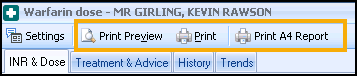 - From the Warfarin Dose screen, select Print Preview, Print or Print A4 Report: