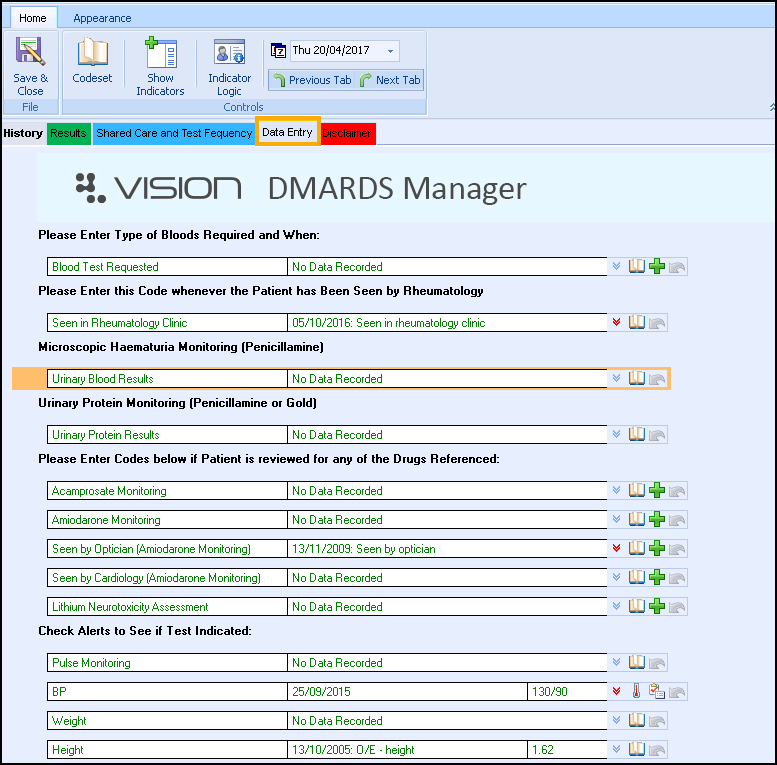 The Data Entry tab is designed to assist you in managing and reviewing your patients on DMARDs.