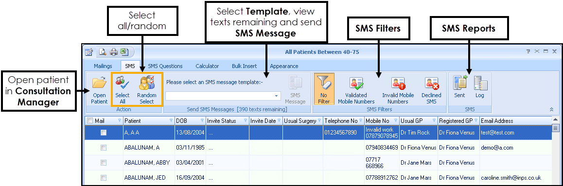 You can send an SMS message to a patient from Consultation Manager - Vision+ - Mail Merge