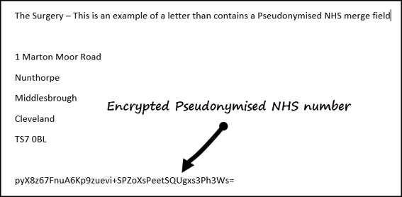 Below is an example of how the NHS number displays in the letter once encrypted: