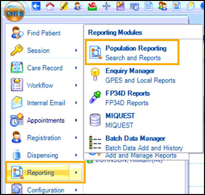 - Open Emis Web, if it is not already open and select Reporting - Population Reporting: