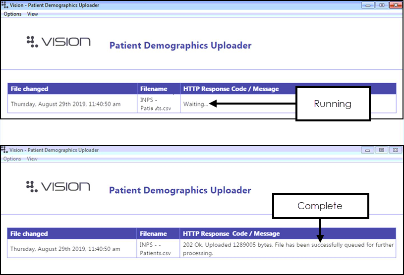 - Once the upload successfully completes, you can close the Vision - Patient Demographic Uploader and npm screens.