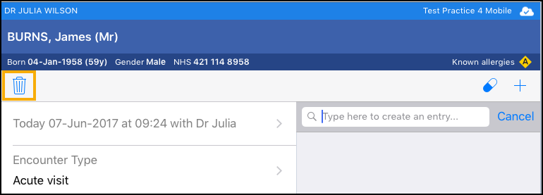 You can only delete encounters if they have not been closed and synchronised with the patient record, for example, if you have opened it from the saved encounter list or you want to delete the encounter you are working on.