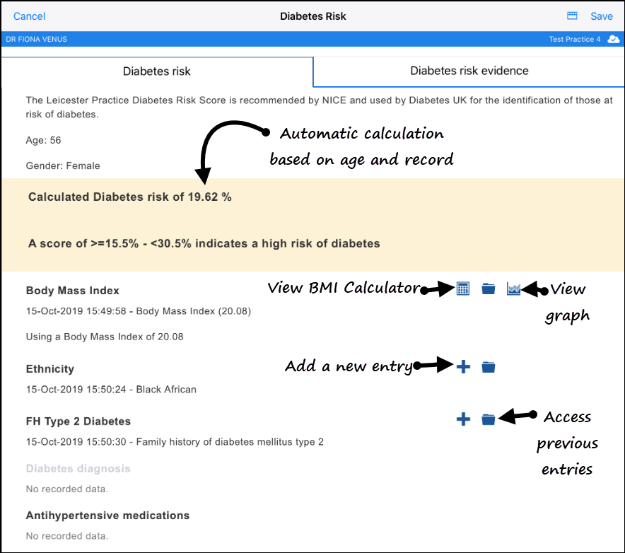 to view historical entries. - To store the calculated Diabetes Risk into the patient's record, select Save.