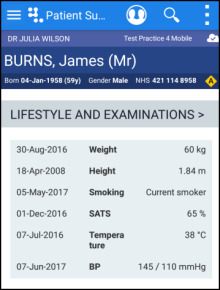 The Patient Summary screen shows the last recorded entry for weight, height, alcohol, smoking, exercise, diet and blood pressure entries.