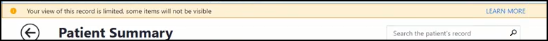 • When you select a patient whose practice is part of a shared care setting with exclusions in place, a 'Your view of this record is limited, some items will not be visible' patient warning banner displays to make you aware you may not be viewing a complete record.