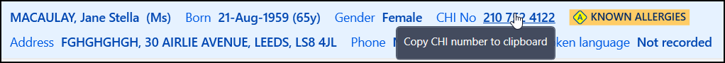 Note - Where a CHI/NHS Number is not recorded, there is no option to copy to clipboard.