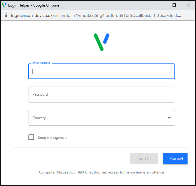 The first time in each session you select Link my Vision account to link your Engage Consult account with your Vision Solution, for example Vision 3 or Vision Anywhere, the Login Helper screen displays: