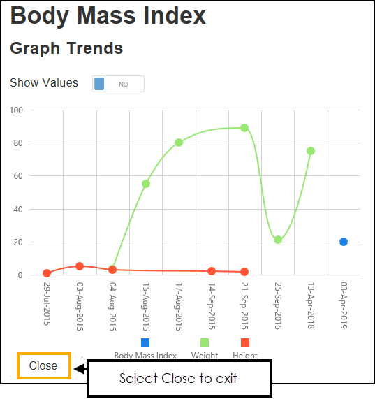 4. Optionally, select Calculator to view/update the BMI calculator, or select Graph to view the BMI/Weight/Height trends: