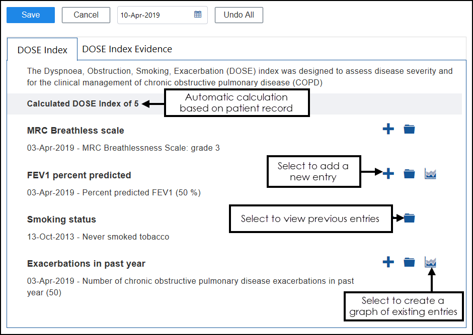 6. To store the calculated DOSE Index score into the patient's record, select Save, alternatively, to exit without saving select Cancel or Undo All removes any changes you have made.