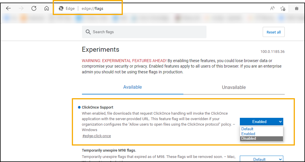 Scroll down to ClickOnce Support and from the available list, select Enabled.
