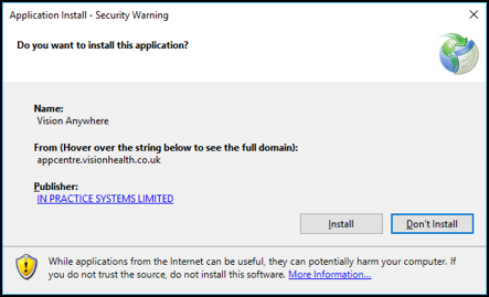 1. Once step 1 is complete, the first time you log in to the workstation and launch Vision Anywhere by double clicking Vision Anywhere , an Application Install - Security Warning displays asking if you want to install the application: