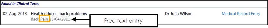 The Patient Record Search screen displays listing all matching coded and free text entries, for example, the following show the results of a search on 'pain':