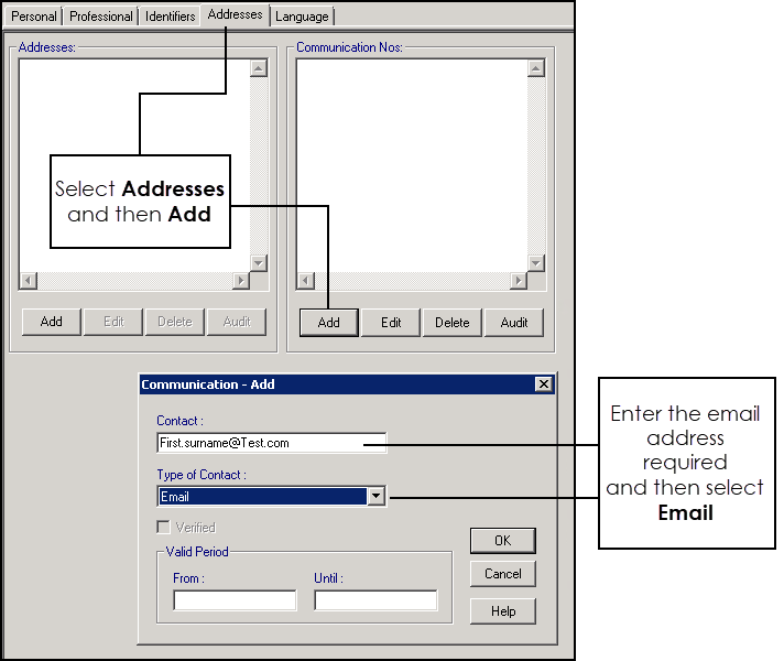 - Under Communication Nos, select Add and the Communication - Add screen displays: