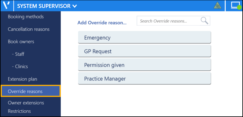 To view your existing Override Reasons, from the Appointments Setup menu, select Override reasons  and the Add Override reason screen displays: