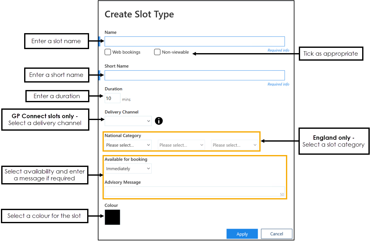 - National Category (England only) - Set a category that fits the slot type using the Setting, Type or Category lists.English practices - See National Slot Categorisation for information on slot categories.