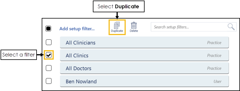 Practice and Practice User saved filters are now clearly separated in Appointments Setup wherever filtering is possible.