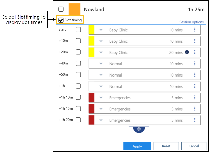 - When creating or editing sessions, you can now view the cumulative slot time since the start of the session. Select Slot timing to display the slot times.